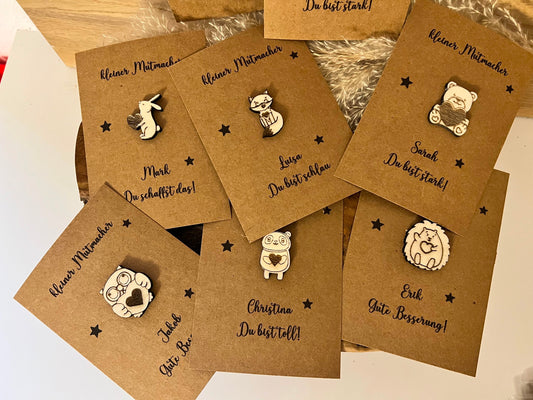 - Kleine Mutmacher-Tiere aus Holz: Liebevoll gestaltete Tierfiguren, die dem Kind Mut und Freude schenken und immer ein treuer Begleiter sind.