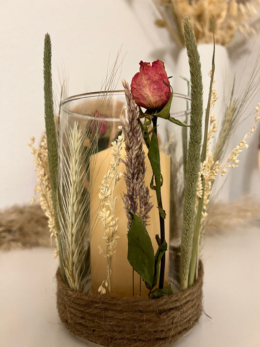 Charmante Windlichter, die mit natürlich getrockneten Trockenblumen geschmückt sind. Sie schaffen eine sanfte Beleuchtung und eine gemütliche Stimmung, ideal für entspannte Abende oder romantische Dinners.