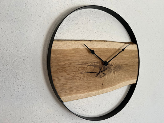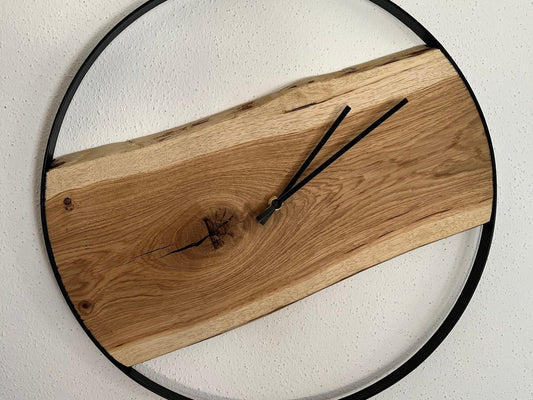 Robuste Wanduhren aus Eichenholz mit einem Stahlring in den Größen 45 cm und 50 cm. Diese stilvollen Uhren fügen sich nahtlos in jede Einrichtung ein und erinnern täglich an den besonderen Anlass des Einzugs.