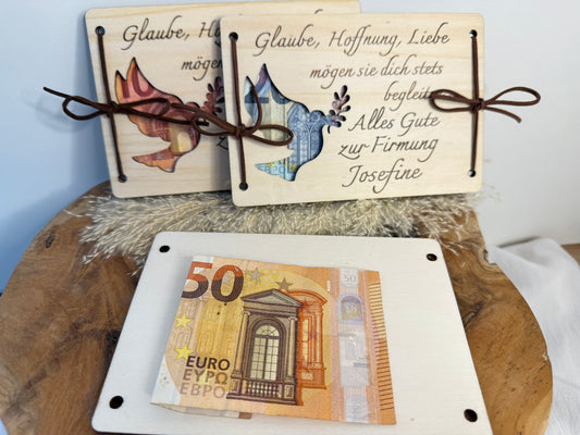 Kombiniert mit einer gravierten personalisierten Holzkarte oder einem kleinen Geschenk zur Firmung kann das Geldgeschenk besonders persönlich und bedeutungsvoll gestaltet werden.