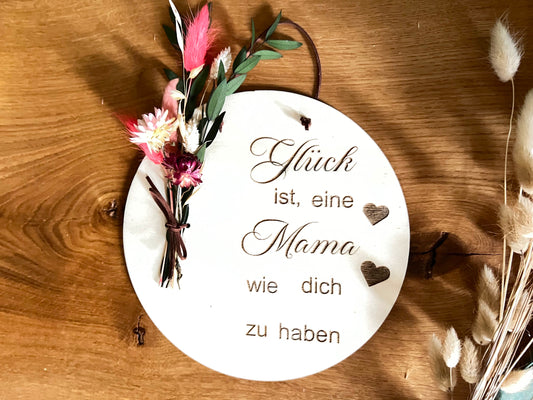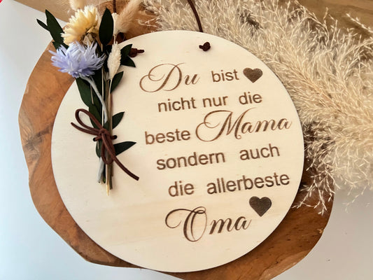 Ein graviertes Holzschild mit einem Durchmesser von 20 cm und liebevollen Sprüchen wie „Glück ist, eine Mama wie dich zu haben“ oder „Du bist nicht nur die beste Mama, sondern auch die allerbeste Oma“ ist ein wunderbares Geschenk. Verziert mit Trockenblumen, ist dieses Schild ein echter Hingucker und eine schöne Erinnerung an die besondere Beziehung zu deiner Mama.