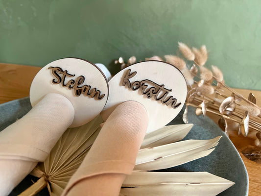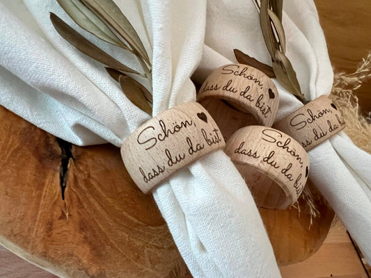 Our personalized napkin rings made of beech and oak wood are the perfect decoration for your festive table. With individual name engraving or the heartfelt message "It's great that you're here," they offer a stylish combination of place card and guest gift. Ideal for weddings and special occasions, leave These handmade napkin rings make a lasting impression and enrich your table decoration with natural elegance and personal charm.