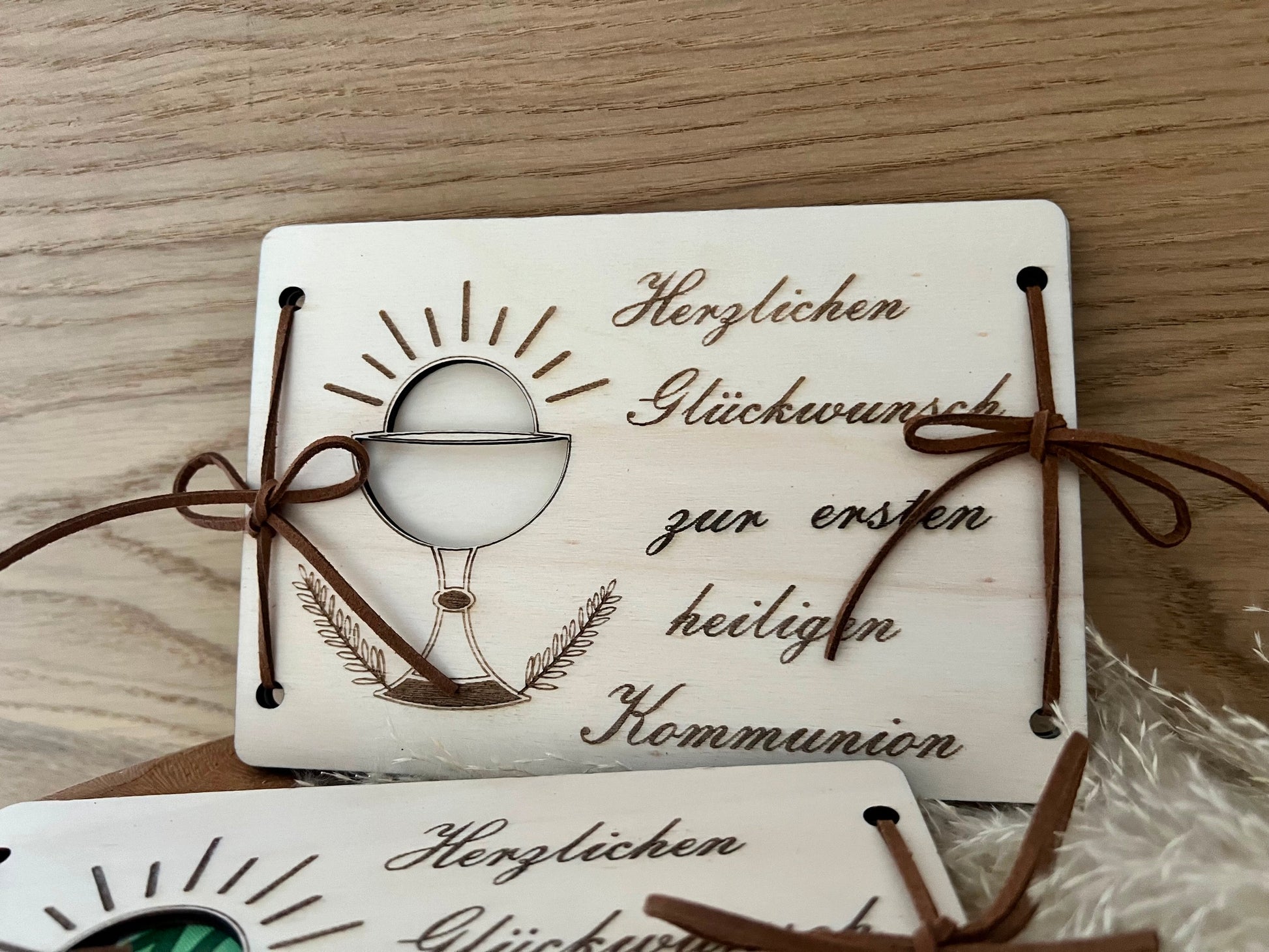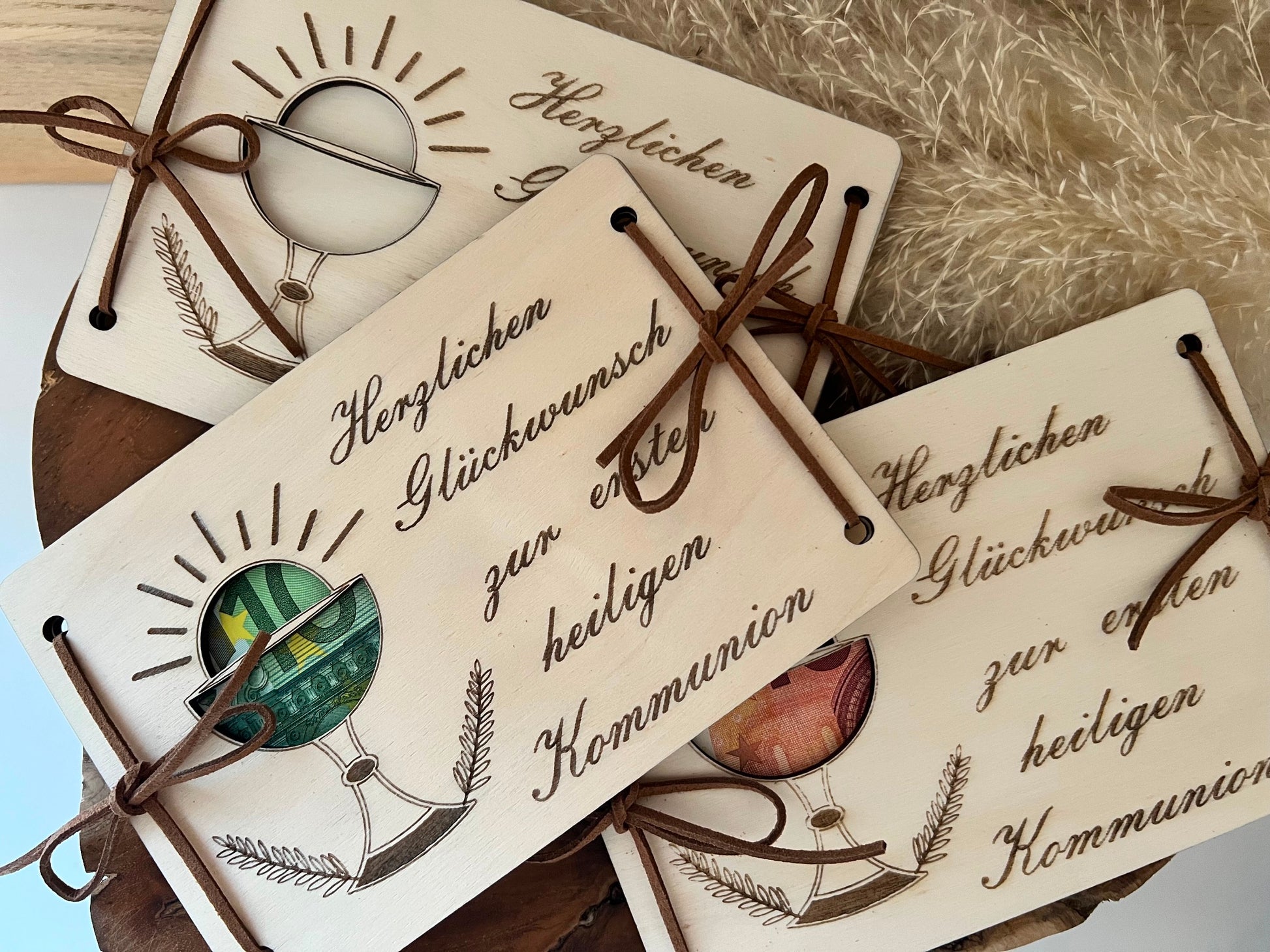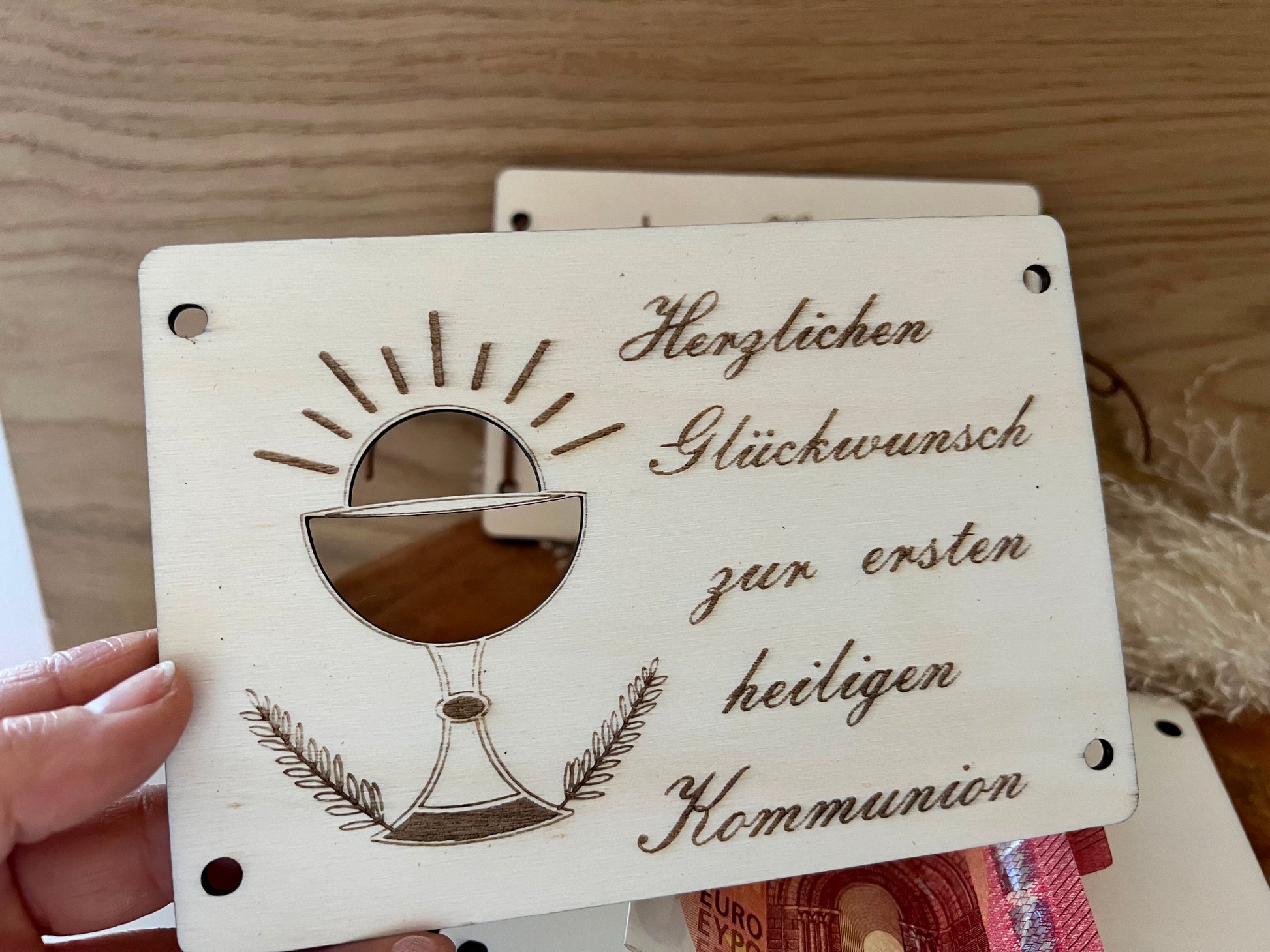 Surprise your Communion child, be it a girl or a boy, with a loving and unique gesture - our exquisite wooden card, which features an engraving and a cut-out chalice through which money can shine. This beautiful card is more than just a congratulations; it will become a lasting memento of a significant day in the child's life.