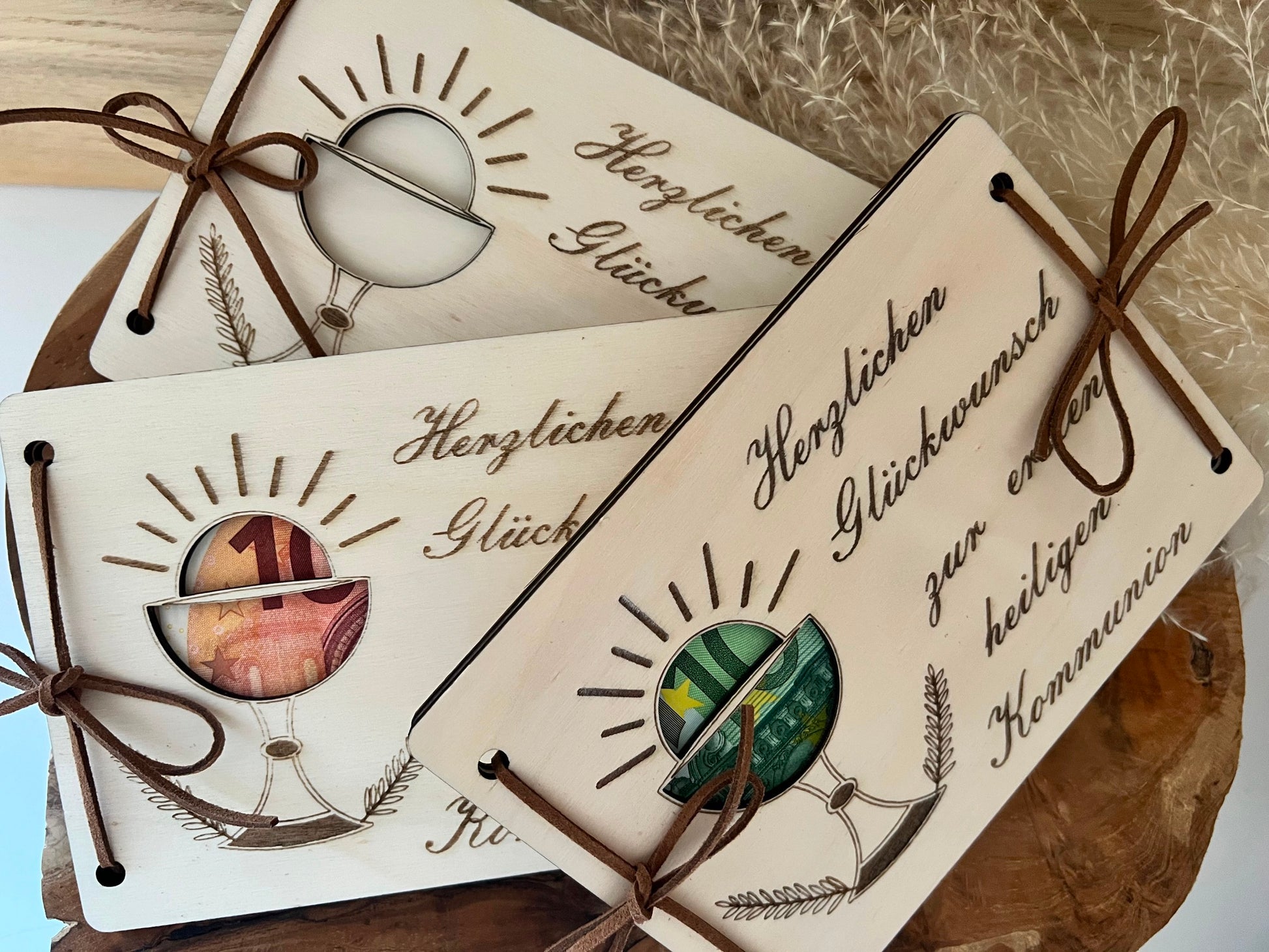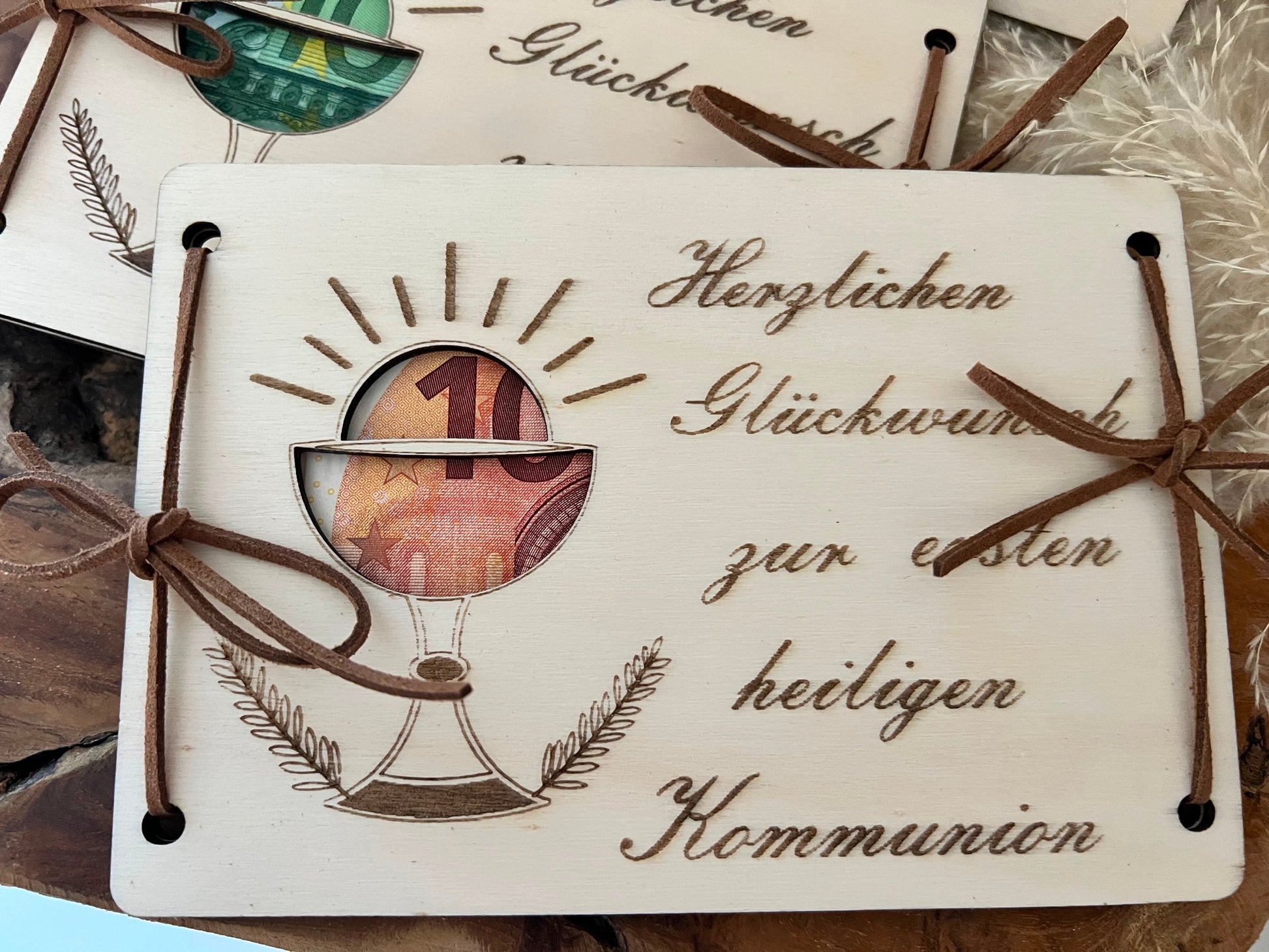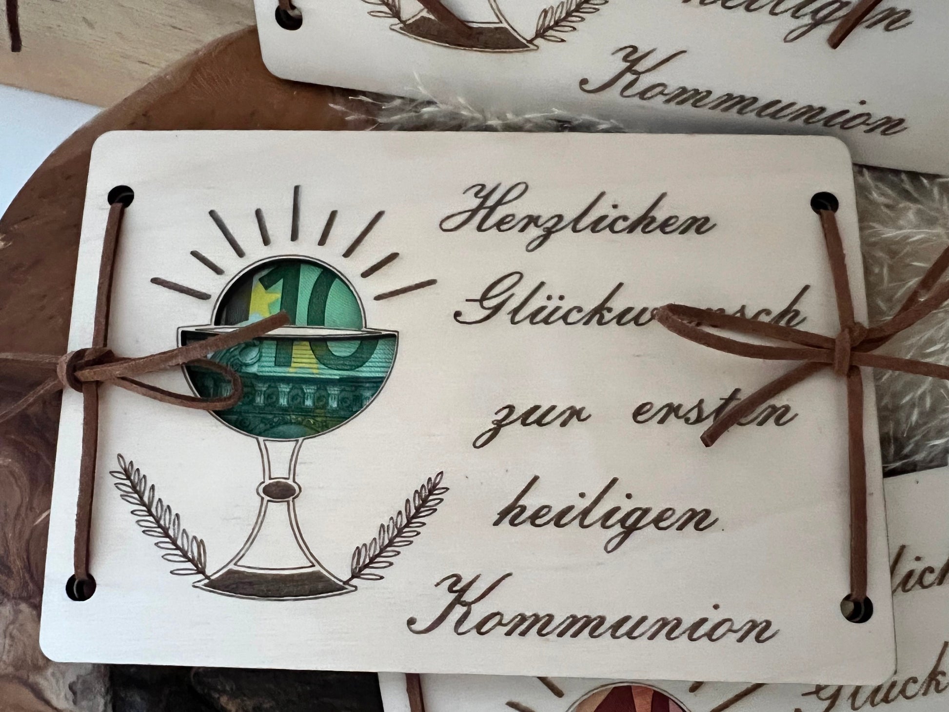 Surprise your Communion child, be it a girl or a boy, with a loving and unique gesture - our exquisite wooden card, which features an engraving and a cut-out chalice through which money can shine. This beautiful card is more than just a congratulations; it will become a lasting memento of a significant day in the child's life.