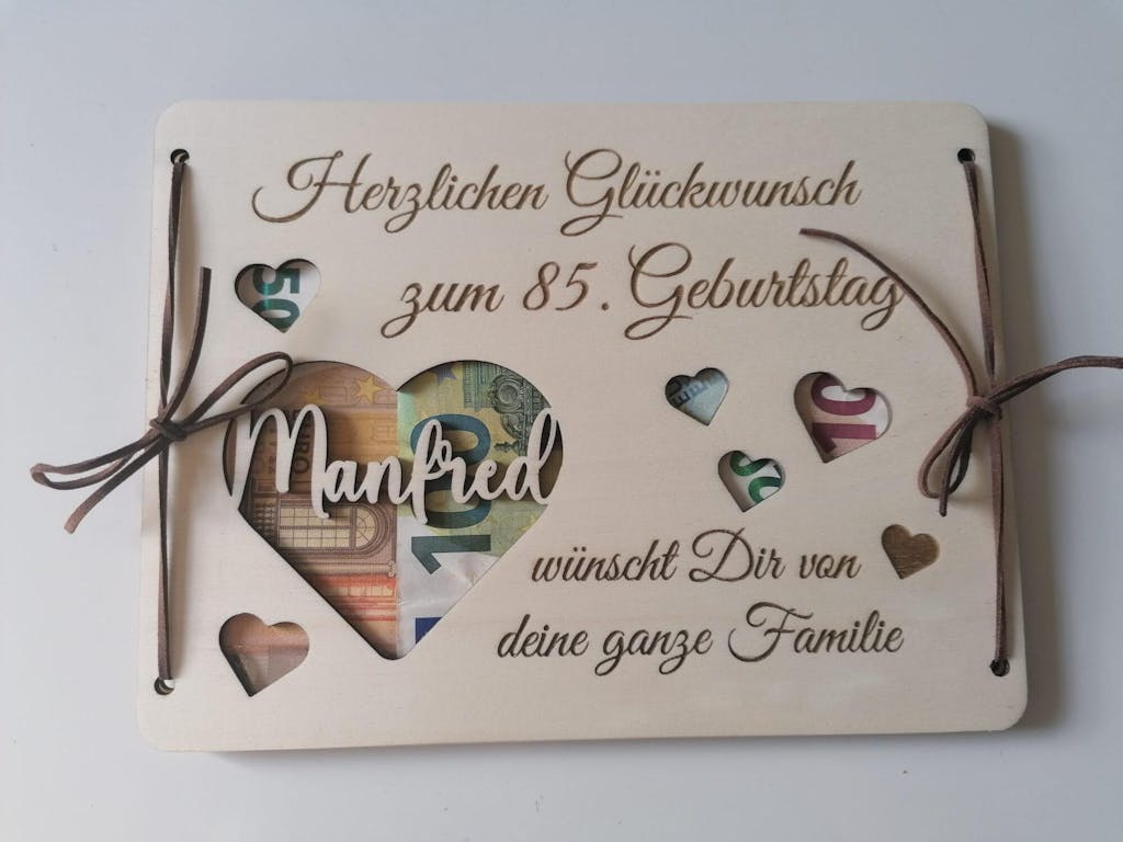 Du suchst nach einer besonderen Art, Geld zum Geburtstag zu verschenken? Unsere liebevoll gestaltete Geldgeschenkkarte aus Holz ist nicht nur eine originelle Verpackung, sondern auch eine bleibende Erinnerung.