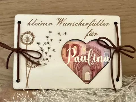 Überrasche deine Liebsten mit einem einzigartigen Geldgeschenk! Unser "Kleiner Wunscherfüller" ist eine stilvolle und kreative Möglichkeit, Geld zu verschenken – sei es zur Hochzeit, zum Geburtstag, zur Taufe oder zur Kommunion.