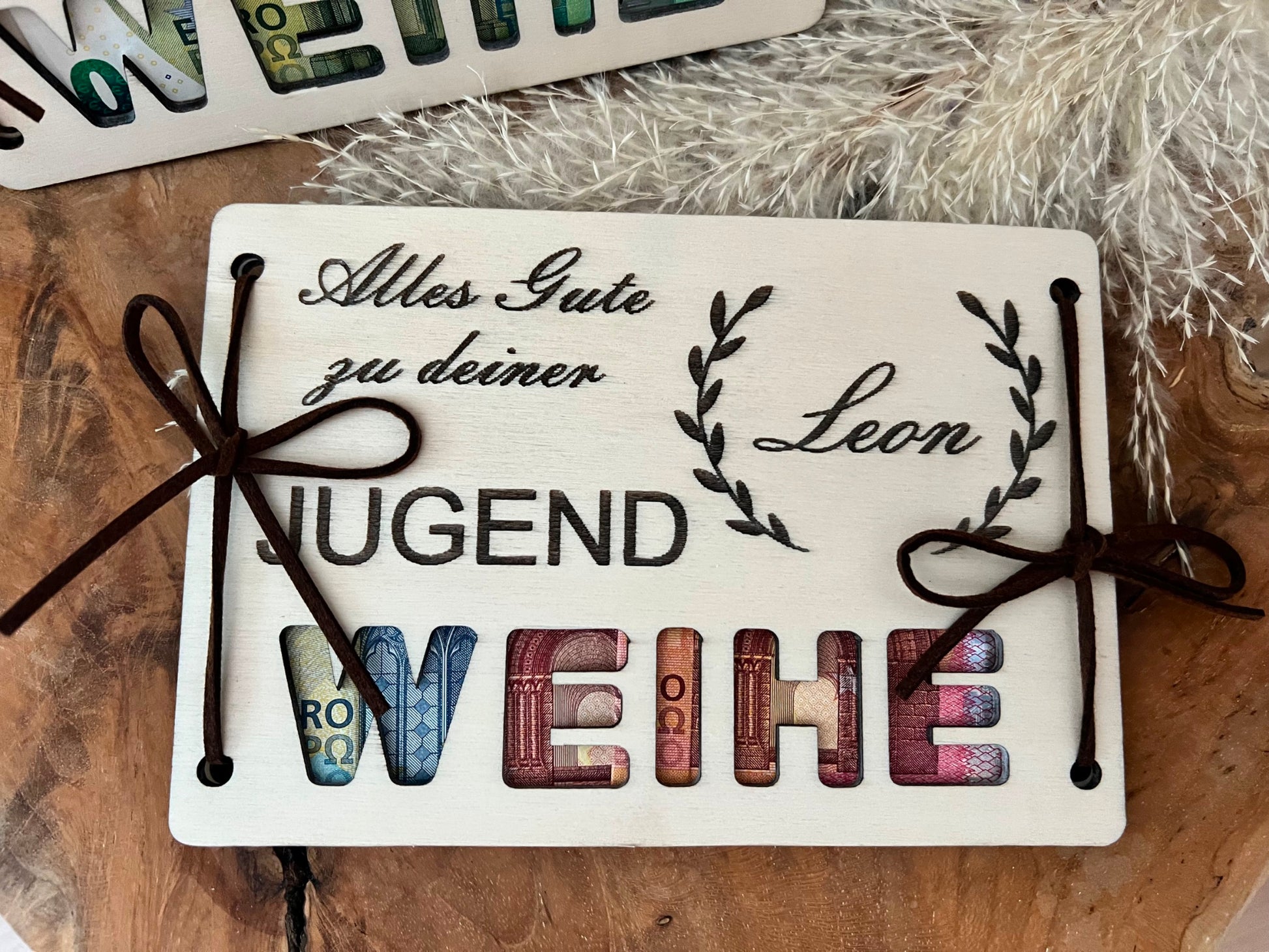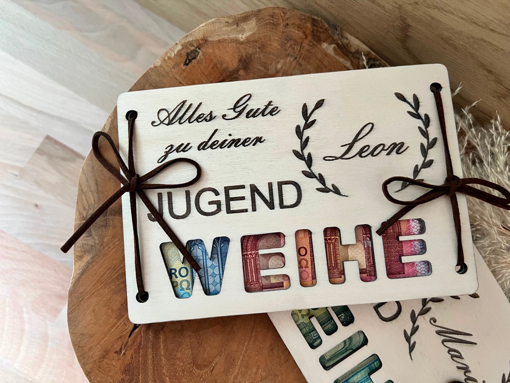 Feiere die Jugendweihe mit einer wirklich besonderen Geste – unsere handgefertigte Holzkarte, die exklusiv mit deinem Wunschnamen graviert ist. Diese einzigartige Karte vereint hochwertiges Holz, edles Design und eine praktische Geldhalterung, um Ihr Geschenk stilvoll zu präsentieren. Jede Karte ist ein Unikat, geprägt von der natürlichen Maserung des Holzes.
