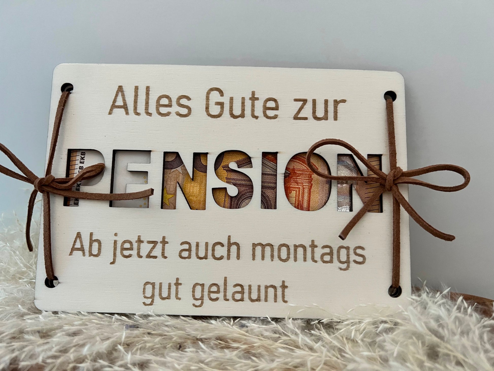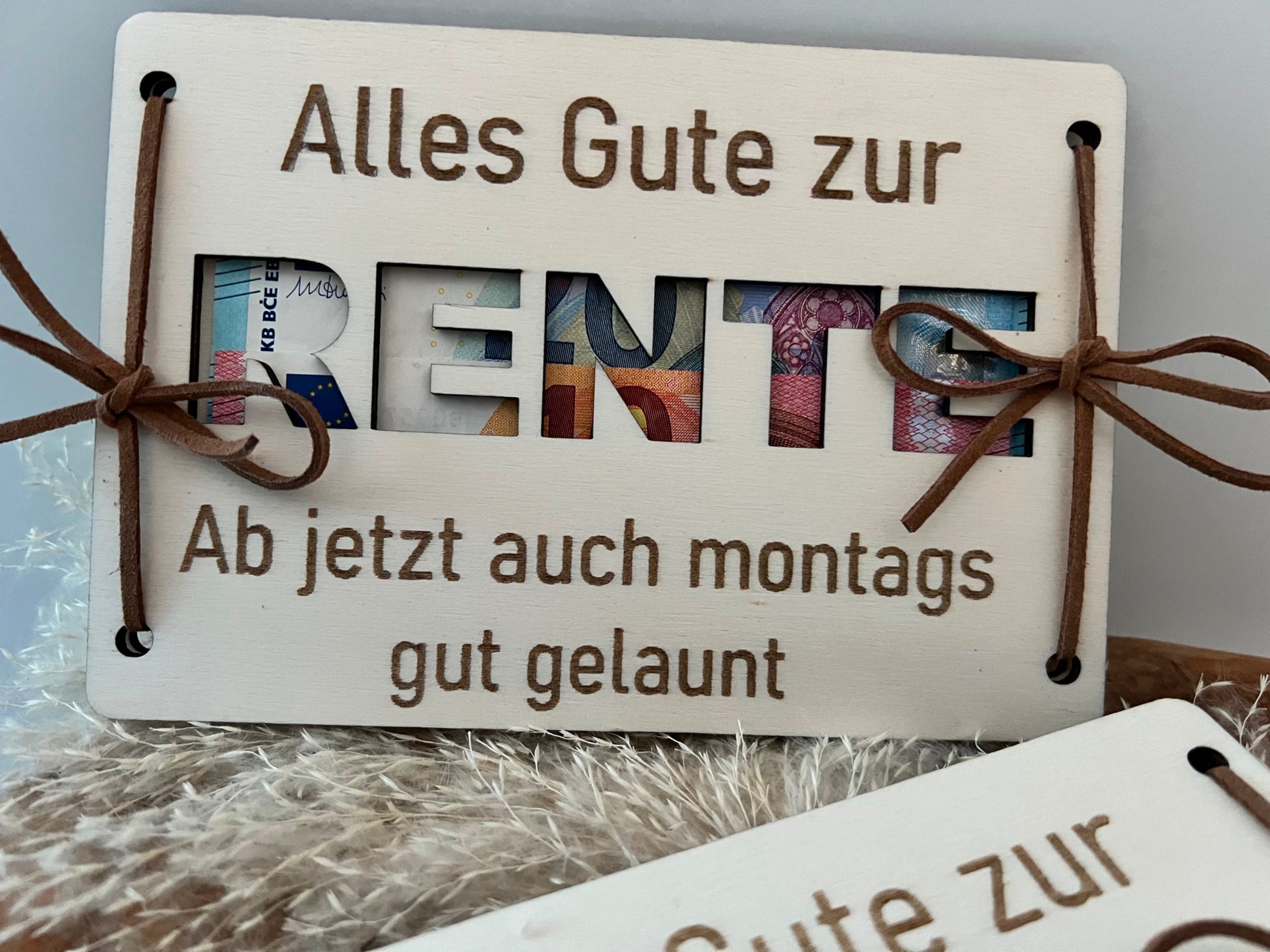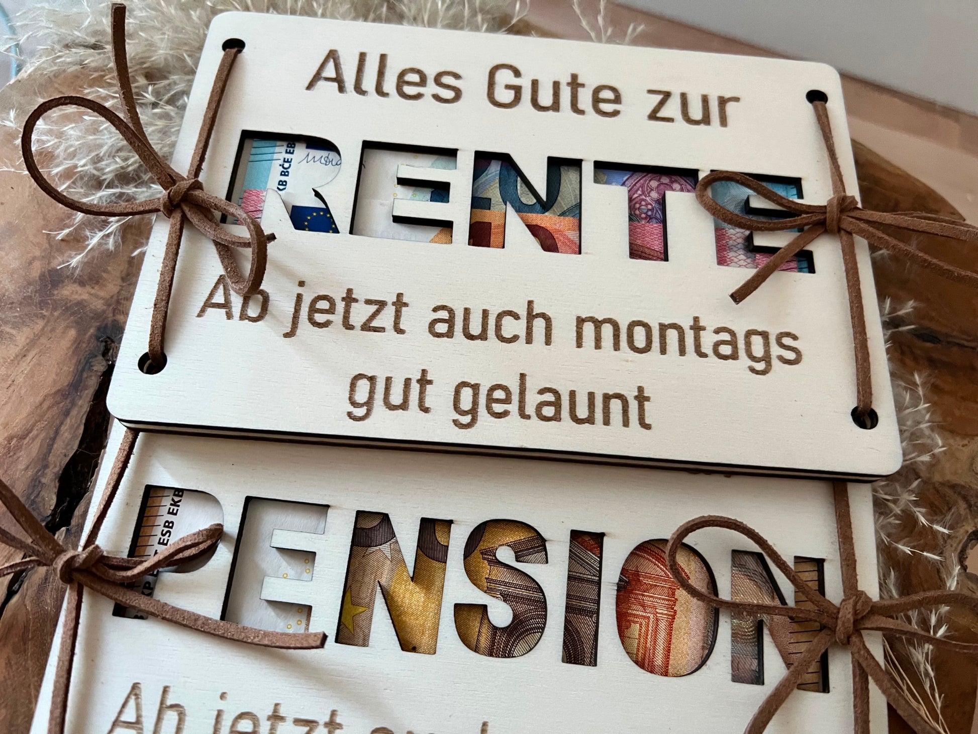 Das Besondere an diesem Geschenk? Das Wort „Rente/Pension“ wurde kunstvoll aus dem Holz ausgeschnitten, sodass das Geld auf originelle Weise sichtbar wird. Eine kreative Idee, die dem Geschenk eine persönliche Note verleiht und zugleich praktisch ist.