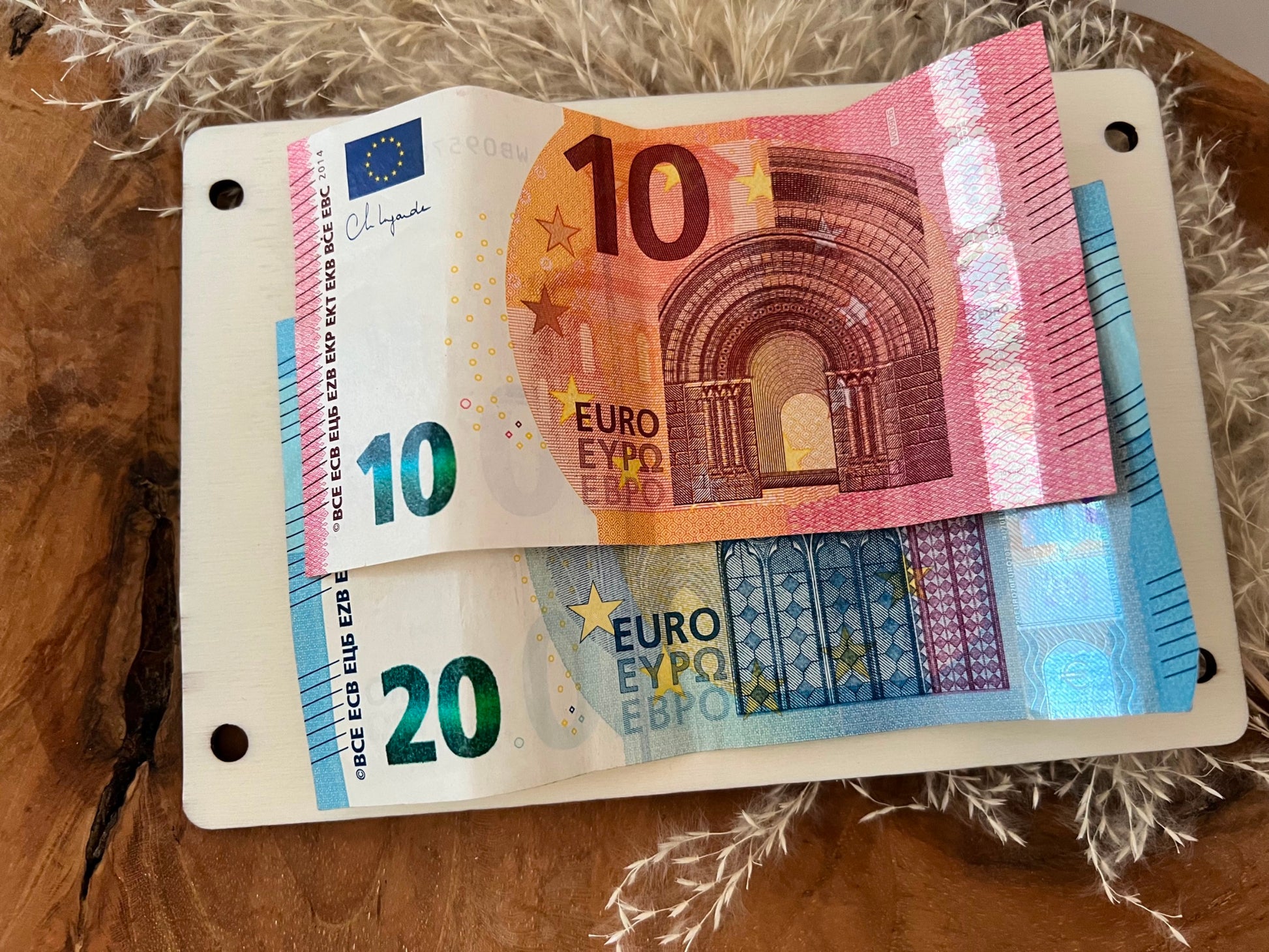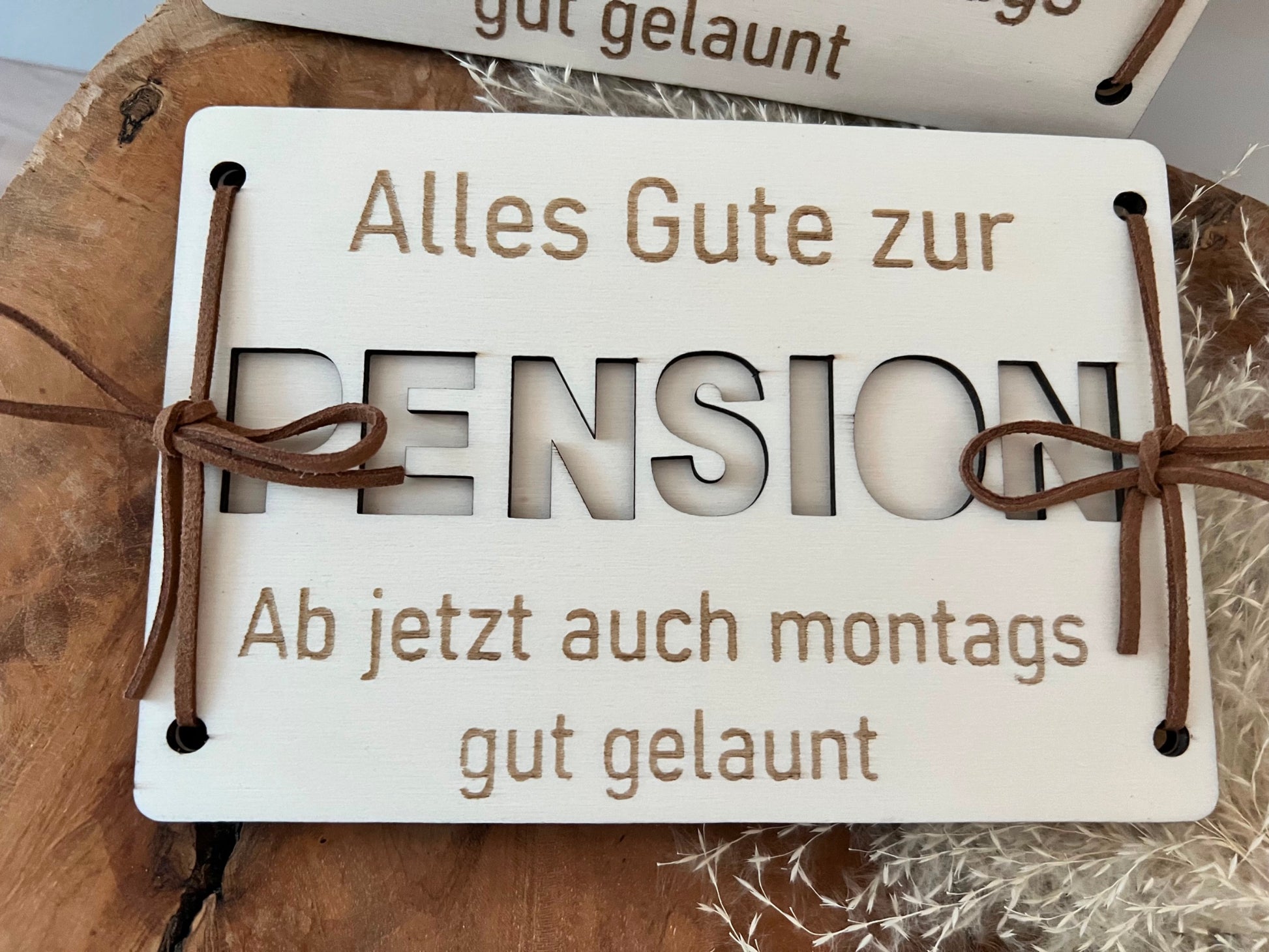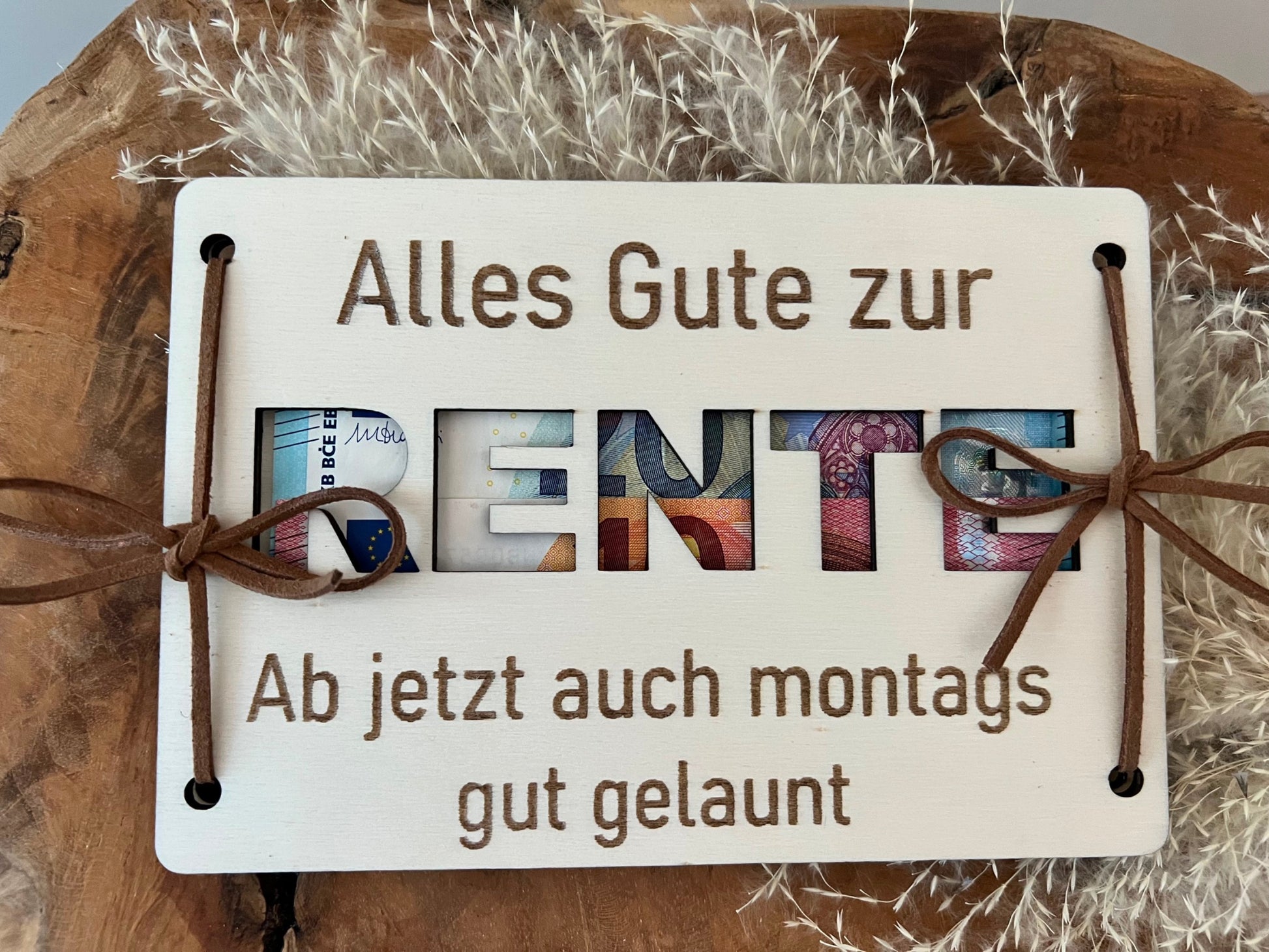 Das Besondere an diesem Geschenk? Das Wort „Rente/Pension“ wurde kunstvoll aus dem Holz ausgeschnitten, sodass das Geld auf originelle Weise sichtbar wird. Eine kreative Idee, die dem Geschenk eine persönliche Note verleiht und zugleich praktisch ist.