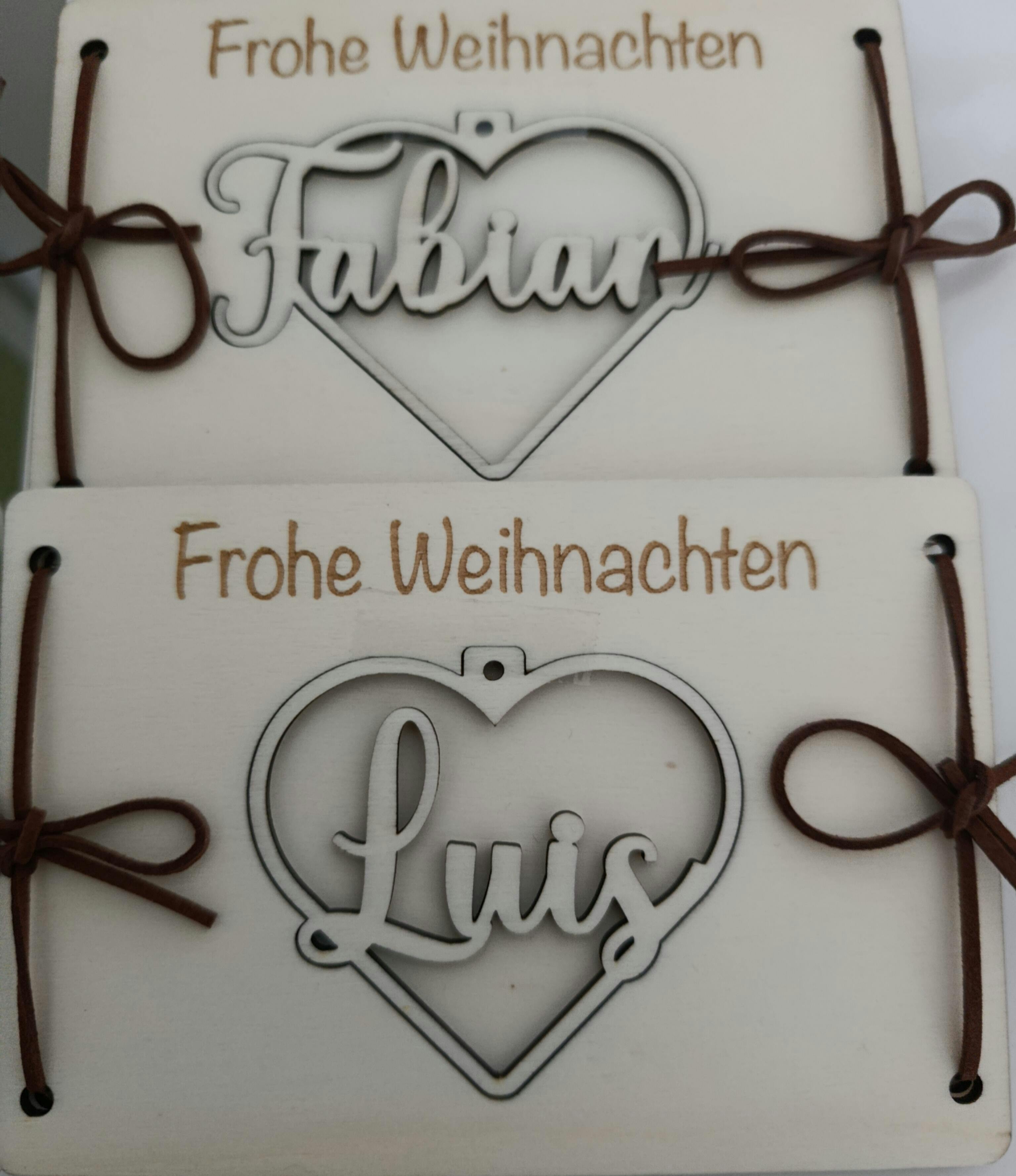 Personalisierte Holzkarte mit Herz-Christbaumschmuck