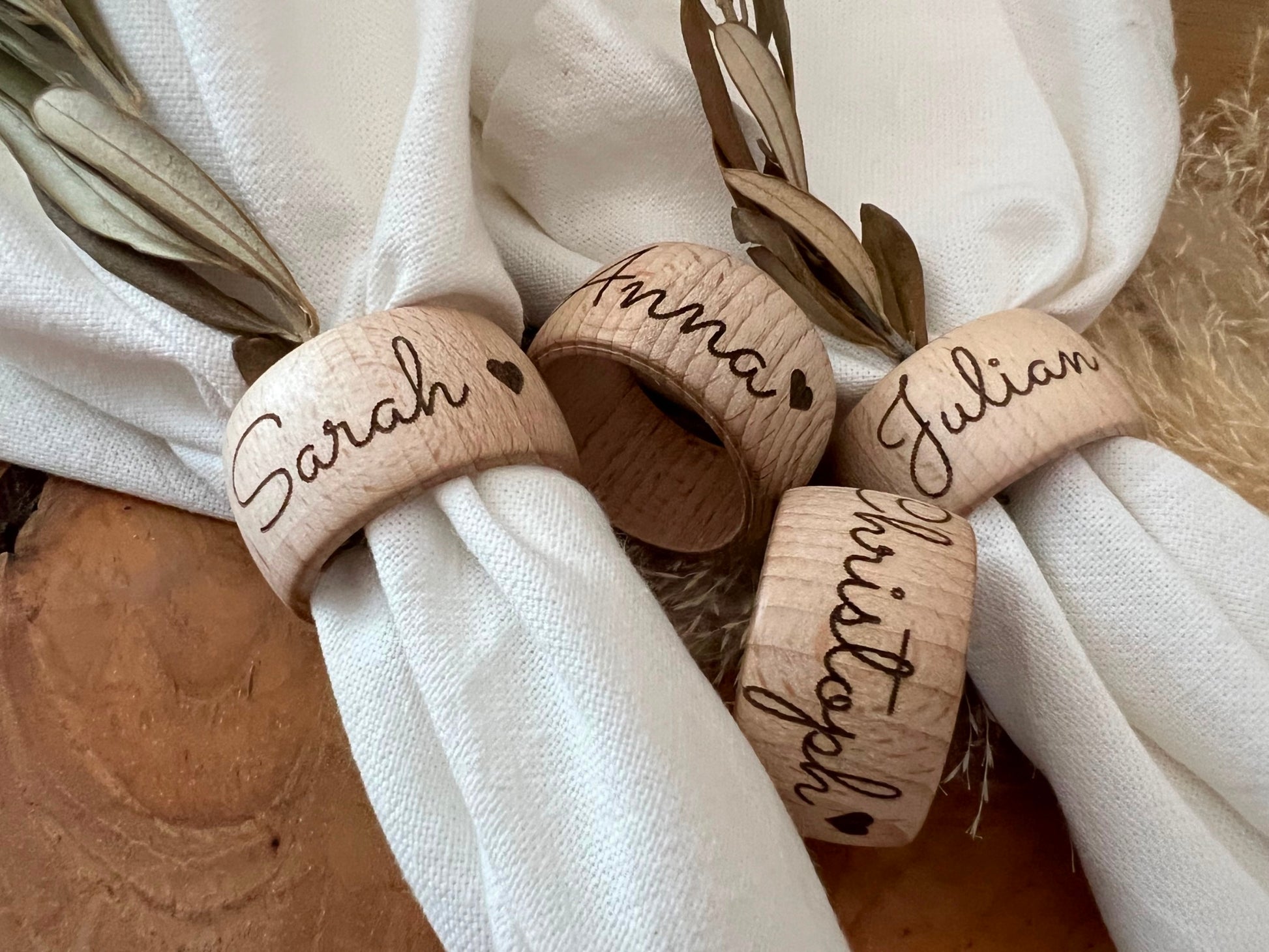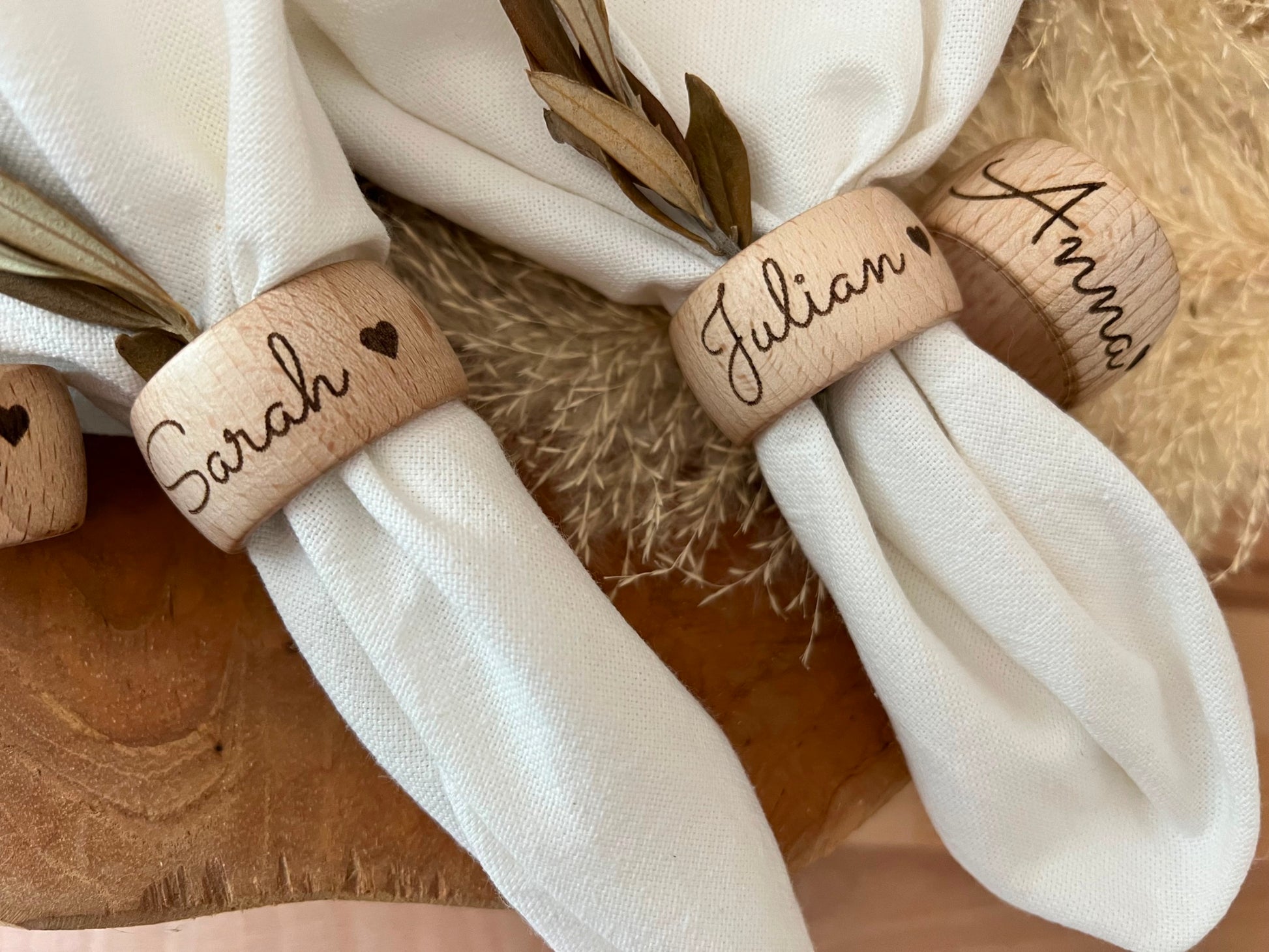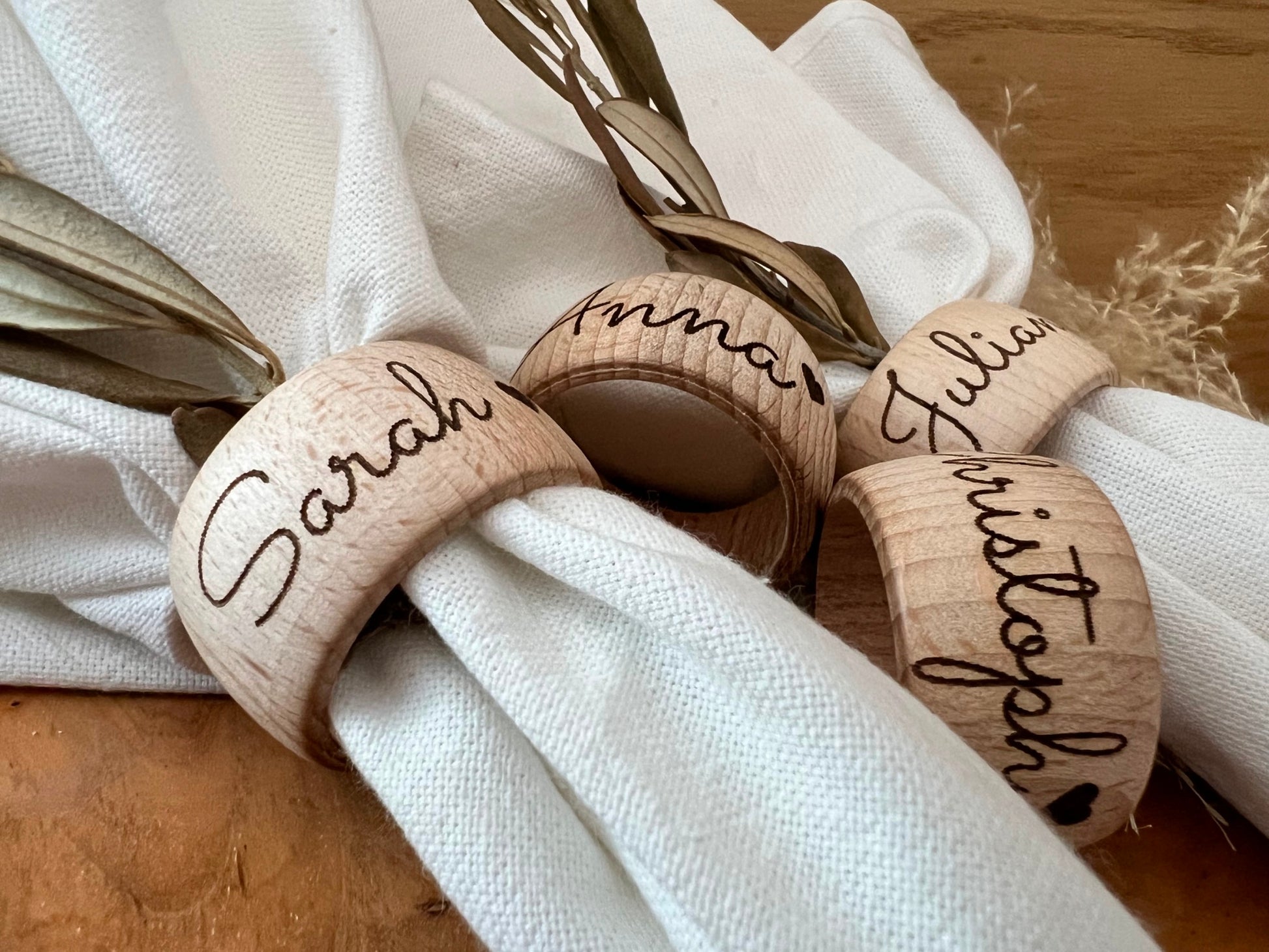 Entdecken unsere einzigartigen Holz-Serviettenringe, die eine hervorragende Möglichkeit sind, deine Tischdekoration bei Hochzeiten, Taufen und anderen festlichen Anlässen aufzuwerten.