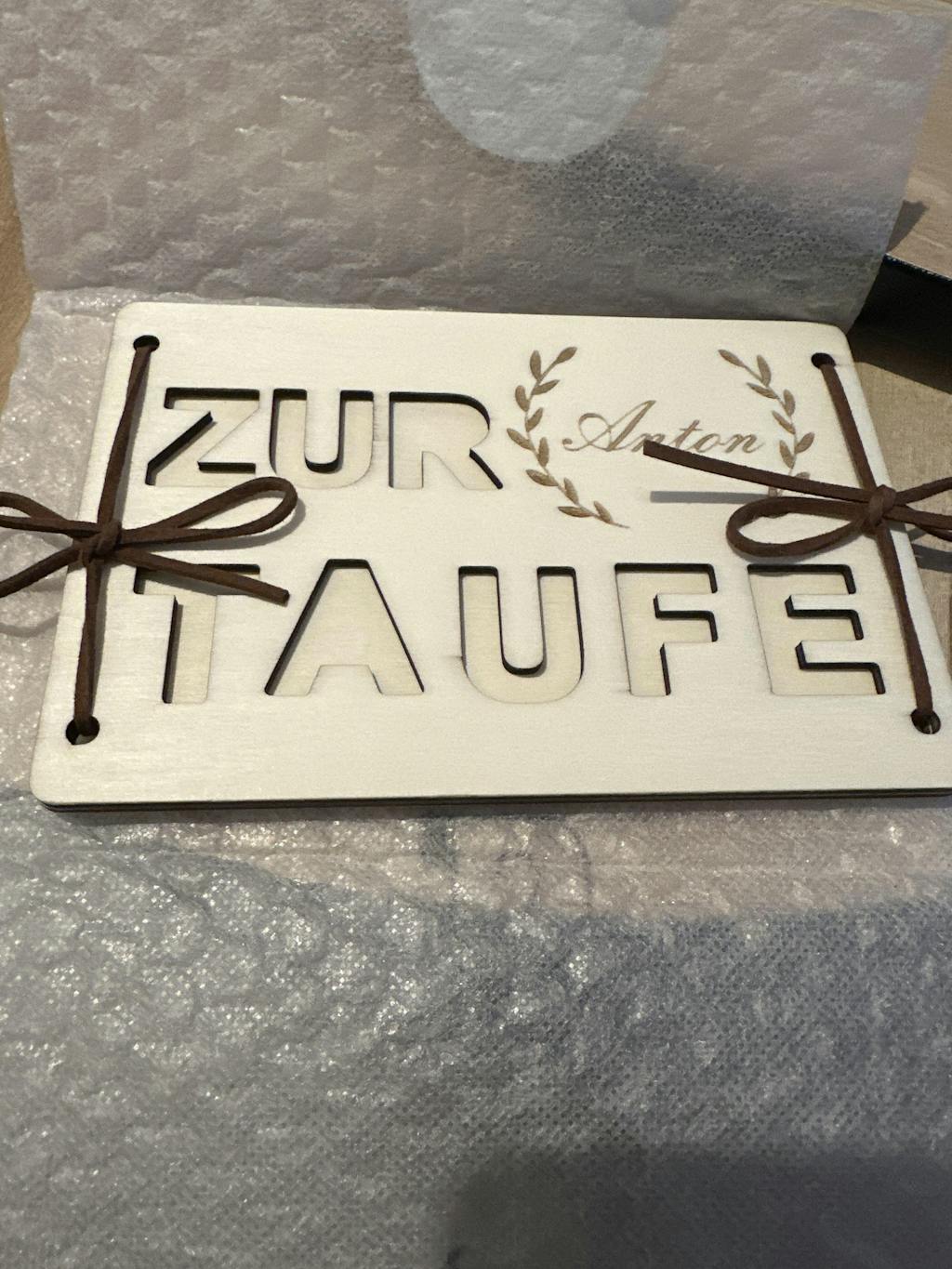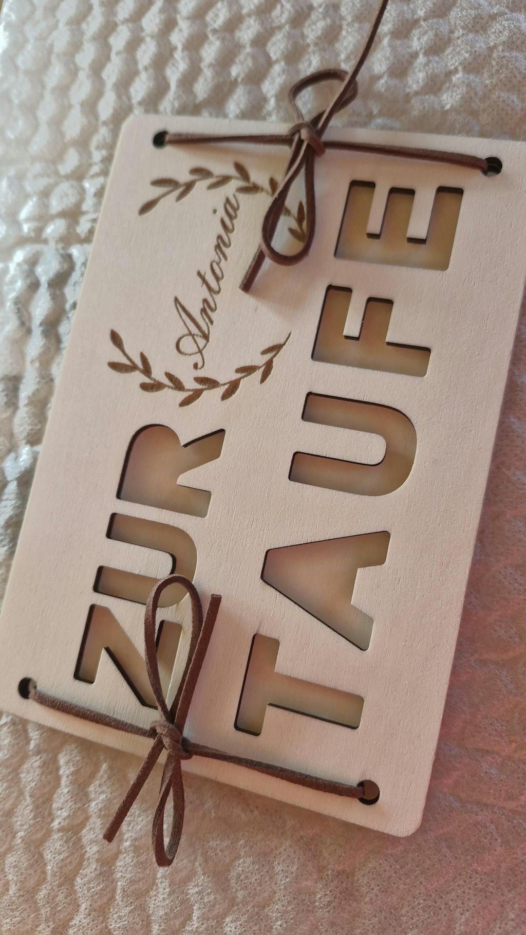 Unsere exklusiv handgefertigte Holzkarte wird mit dem Namen des Taufkindes individuell graviert, um eine bleibende Erinnerung zu schaffen.